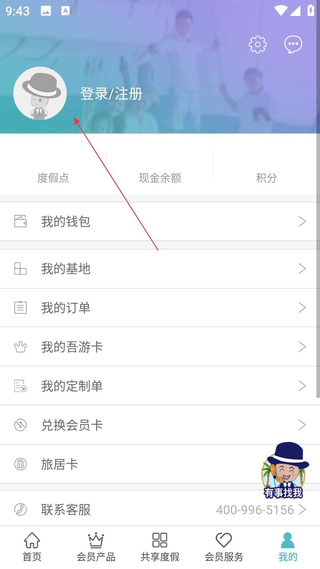 3、进我的页面,点头像登录注册,完成后,管理订单、钱包、积分,便捷使用度假服务。