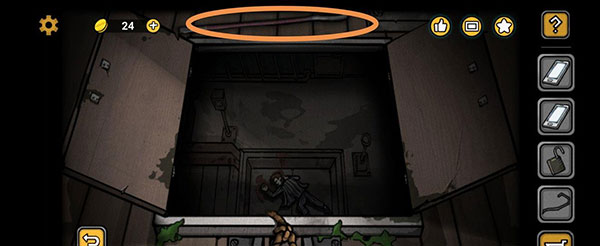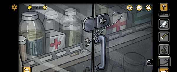 我们回到最初待着的房间,点击大门,用钳子剪断连着的地方,出门后在左边门的下方取得铁丝。
