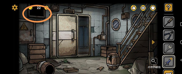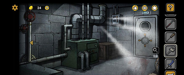 通过通道口,在楼梯的正下方发现一个螺丝刀柄。然后右转,在麻袋中取得配电室钥匙。