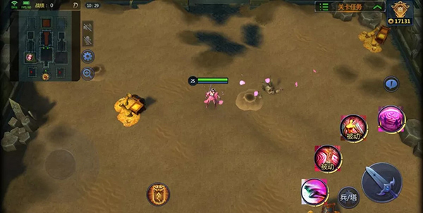 进入游戏后,可以看见游戏界面左侧的固定摇杆,右下角为攻击键及技能键,右上角为装备浮标。玩家使用屏幕左侧摇杆操控英雄移动,移向目标地点。点击右下角攻击键,即可进行普通攻击操作。击杀小兵,可以获得经验值及金币,击杀英雄,获得翻倍经验和金币,累积击杀可获得荣誉称号。