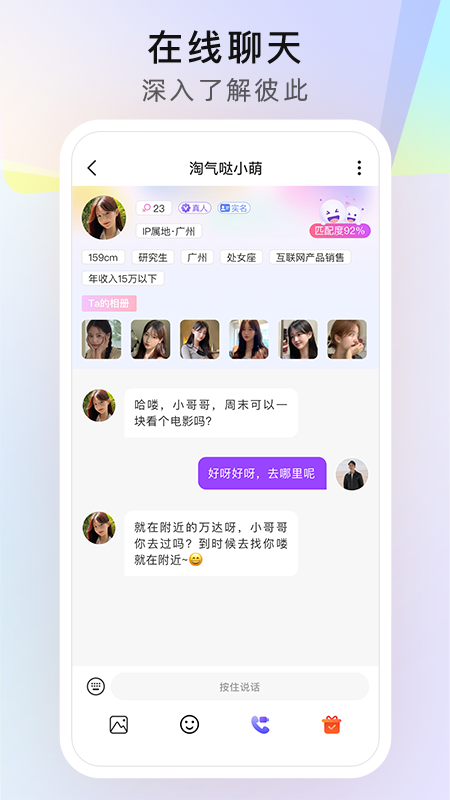 3.与TA进行文字、图片、视频通话等多种聊天方式,深入了解