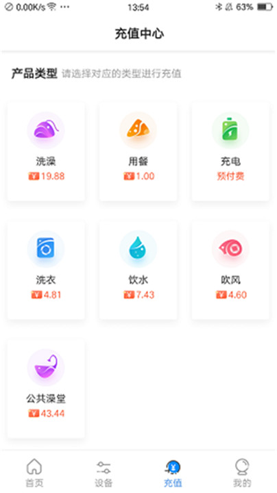 1、首先您可以进入到乐校通APP充值界面,然后您可以选择用水、用餐、饮水、充电、洗衣、购物或其他;