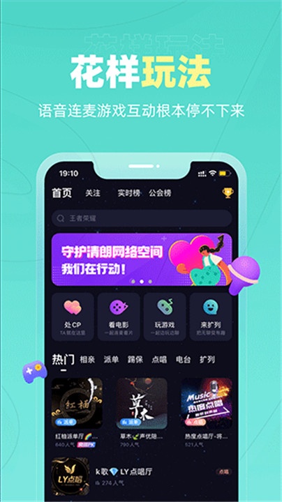 K歌,扩列,电竞,踢保,相亲,处CP,海量娱乐派对应有尽有。多人语音连麦交友畅聊,相亲房、电影房、电台房、拍卖房、情侣房、K歌房等个性房间,打造你的专属线上派对;