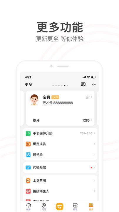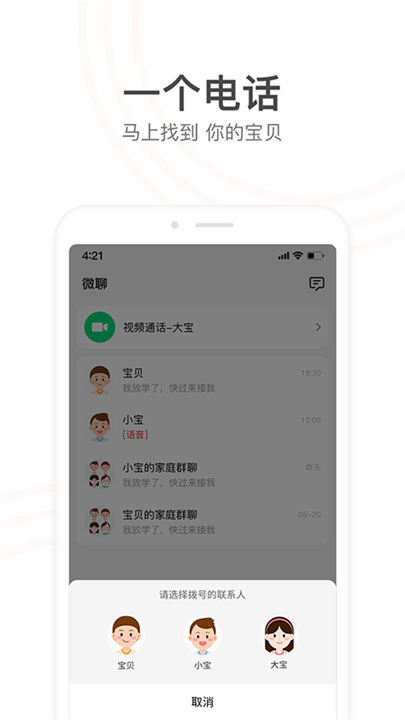 2、微聊:实时的语音聊天,与孩子更加便捷的沟通,使家庭关系更加亲密和融洽;