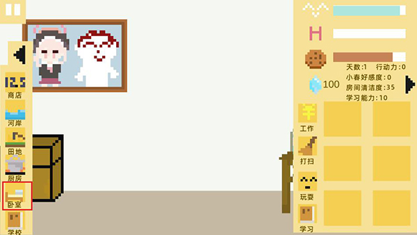 7、如果当天体力被消耗完,左下角打开地点面板,前往卧室,点击床,即可睡觉进入下一天