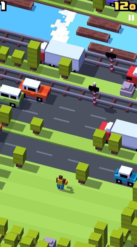 ※玩家点击屏幕控制角色前进或左右移动,避开汽车、火车、河流障碍。