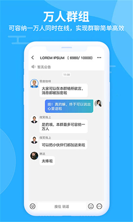 最大群组容量可达到一万人同时在线沟通,同时拥有成员保护、匿名聊天等功能保护群聊安全。