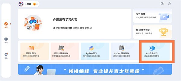 3、这边可以看到有【服务直播、核桃赛考、C++创作等内容】这边以C++为例点击