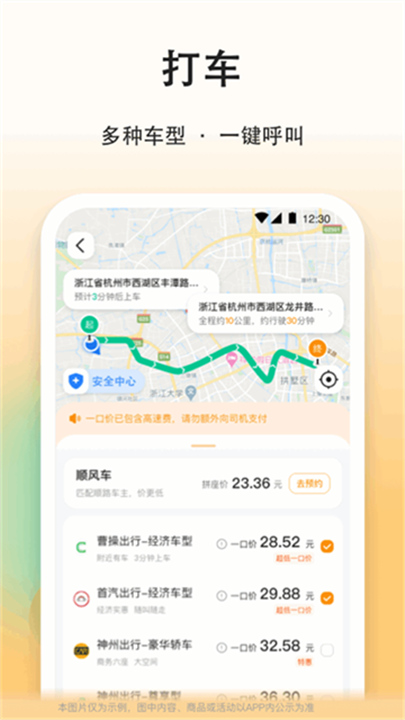 点击“马上用车”后,在弹出的车辆类型菜单中,您可以查看不同车型的价格标准,选择一种车型后,点击“开始用车”即可发起呼叫。