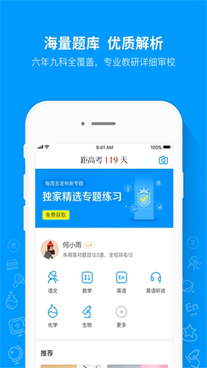 题库覆盖数学、英语、语文、物理、化学、生物、政治(思想品德)、历史、地理九大学科的教材知识点,各科习题尽收囊中。