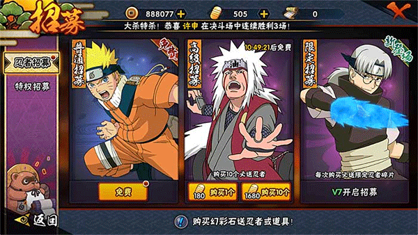 忍者招募:在这个看脸的世界里面,所有的不得意都可以怪脸不好,在火影忍者手游里面,最看脸的玩法就是忍者招募(抽抽抽)!忍者招募的玩法是通过消耗【羁绊之卷】随机抽奖,玩家会有一定的几率抽到忍者碎片。高级招募和普通招募基本上是一样的,但由于需要消耗金币抽奖,所以每抽十次一定会送一个忍者,金币充裕的玩家们可以试一试。至于限定招募和特权招募就是土豪玩家的玩法了。