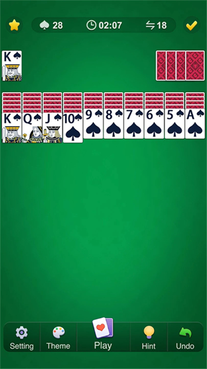蜘蛛纸牌需要一定的策略和计划,玩家需要考虑每一步的影响,合理地移动牌,以便最大化清除牌局的可能性,这使得游戏更具挑战性和乐趣;