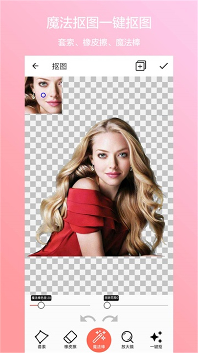 由套索、橡皮擦、魔法棒、放大镜四个功能,每一个功能都有对应的参数调整。
