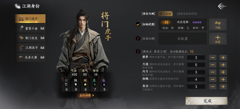 5、玩家可选择江湖身份,并选择初始武器,以及自选天赋,和分配属性点;
