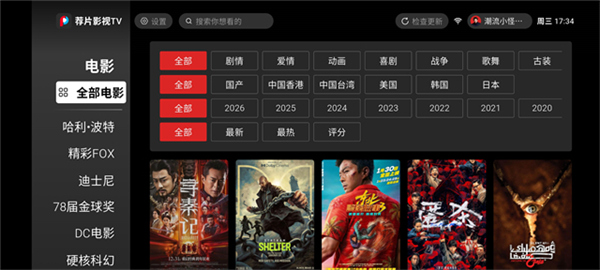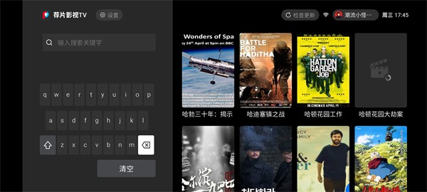 点击顶部搜索框,弹出电视虚拟键盘,输入影视名称、演员或导演等关键字,搜索结果会实时显示在右侧界面,帮助你快速找到目标影片。