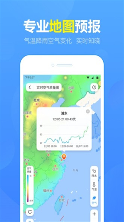 3、实时空气质量监测:认真呵护您的健康,实时更新空气质量、PM2.5等指数预报提供未来48小时及15天空气质量预报。