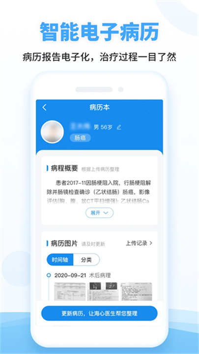 3、【智能电子病历】患者上传完整病历图片后,平台将智能梳理治疗历程,以时间维度清晰呈现,电子病历携带方便,有助于医生诊疗时快速了解病情。