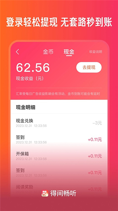 1、金币会按照比例每天凌晨自动兑换成现金,用微信登录后可以进行提现。接下来告诉大家获得金币的一些方法。