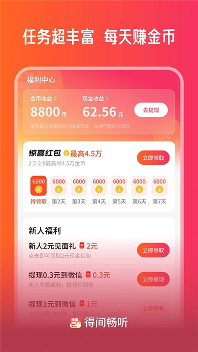 下载得间畅听官方版是短视频+轻松赚币的应用,用户可以刷各类搞笑、生活、影视片段视频,同时通过观看激励视频、签到及完成任务获得金币。金币可每日自动兑换为现金,支持微信提现,操作简便。应用内容覆盖广泛,包括美食、萌宠、科技资讯和旅行攻略,更新及时。轻松娱乐的同时还能积累收益,让碎片化时间也变得高效有趣。