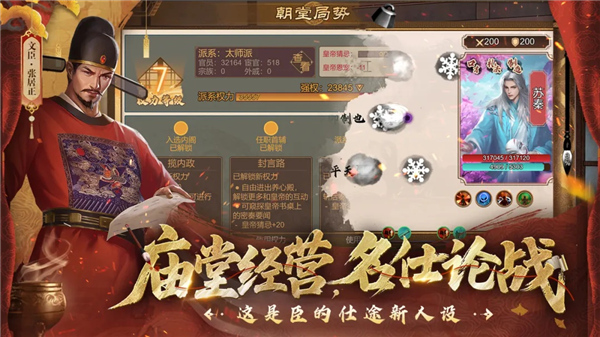 亦或是寒窗苦读考取功名,逆袭成为权倾朝野的官员。战斗方式主要以论战文斗的形式。后续也会开放更多人物路线供大家游玩,大家可以尽情期待。