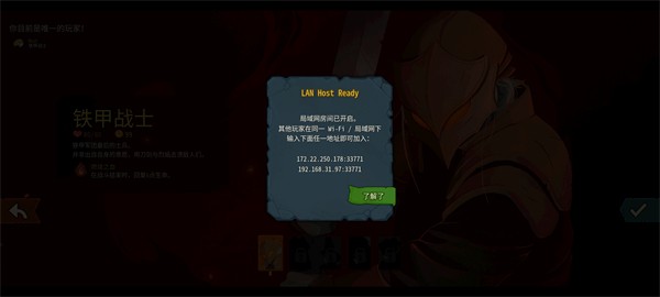 3、创建房间后,系统会显示如何让好友加入:局域网房间已经开启。确保其他玩家和你在同一Wi-Fi网络或局域网下,输入提供的【Host IP】地址即可加入。