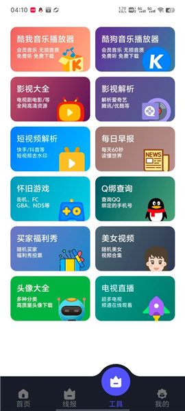 3、工具齐全实用,内置小工具页面,集成音乐播放、视频聚合等工具,减少多软件安装。