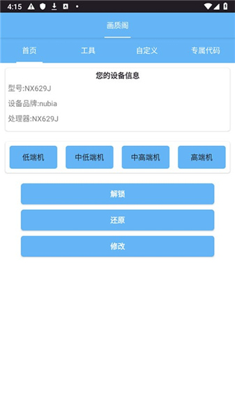 1、打开画质阁8.0,首页会展示您的机型,根据自己的需求选择低端机或者高端机