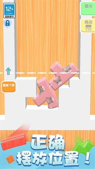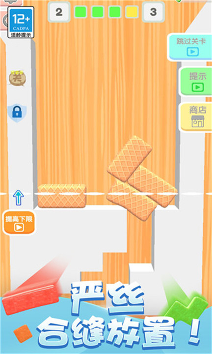 1、游戏中会有不同形状的方块掉落,玩家需要将方块正确地摆放,让所有方块在摆放完成后位于标准线下即可通关。