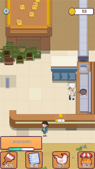 下载在炸鸡店,玩家需要购买母鸡来生蛋,产出小鸡来制作成炸鸡,还可以解锁各种美味的菜谱,为客人提供金币。
