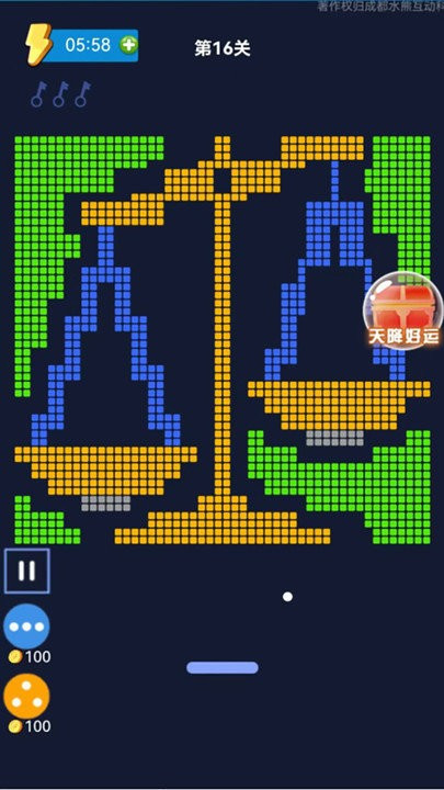 3、在小球消灭砖块的时候,有几率掉落道具,接住道具会触发小球的不同效果。