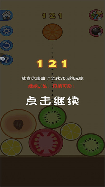 1、按住把球球拖到正确的位置,抛下去,合成更加的水果。