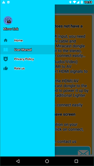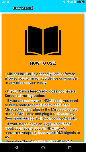 如果您的立体声系统有hdmi输入,您需要购买一条公转母hdmi电缆和Miracast加密,将Miracast加密卡插入hdmi电缆并将其插入立体声系统,然后打开我们的应用程序并单击轻松连接,如果你的立体声有AV(音频/视频)输入,你必须购买HDMl到AV,转换器(适配器),它将HDM1信号转换为AV,然后将AV电缆插入HDMV/AV转换器,并将Miracast加密狗插入HDMI/AV转换器,然后打开我们的应用程序并轻松单击连接,如果您的汽车的立体声收音机具有屏幕镜像选项,在您的立体声系统上启用屏幕镜像选项&打开我们的应用程序并单击连接,这很简单。