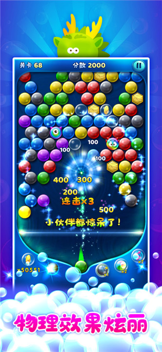2、消除的连击数越高,获得分数就越多,完美组合更多相同泡泡进行消除。