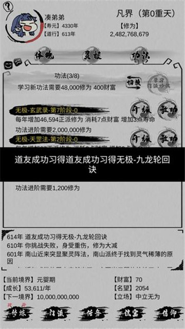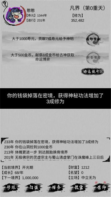 游戏模式可以根据玩家自己的喜好进行,而不需要强迫主角去疯狂修炼,有很多种方法可以实现飞升,大量的历练、随机任务、修炼系统,都可以让玩家自己去探索,也可以选择加入其他宗门,学习更多的功法。