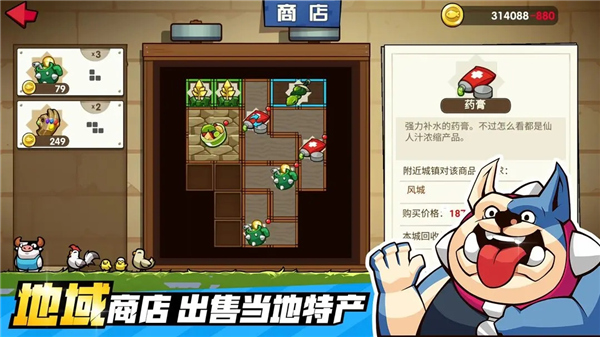 玩家要留意自己的物品和物品,并与其它动物进行冒险,在开放的地图里尽情探险,获得更多的资源和物品,打造一个成熟的店铺,并出售许多独特的商品,以保证日常的商业发展,在这片广袤的土地上,玩家们会的到更多的发展。