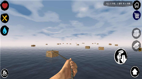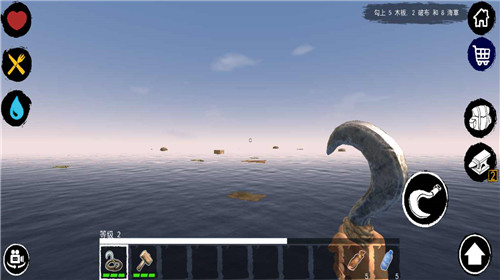 1、开局时用钩子收集资源,可以收集漂浮的杂物牡蛎让自己生存下去。