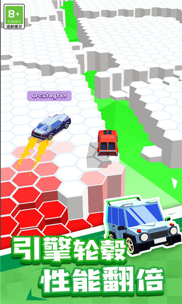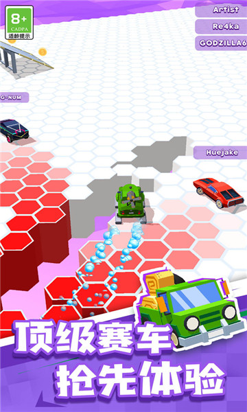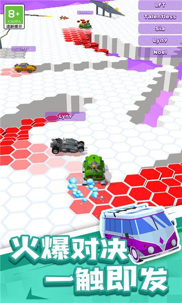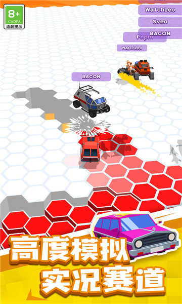 1、玩家需要操控赛车进行挑战,在走过的路会留下不同颜色的印迹,努力扩大自己的面积。