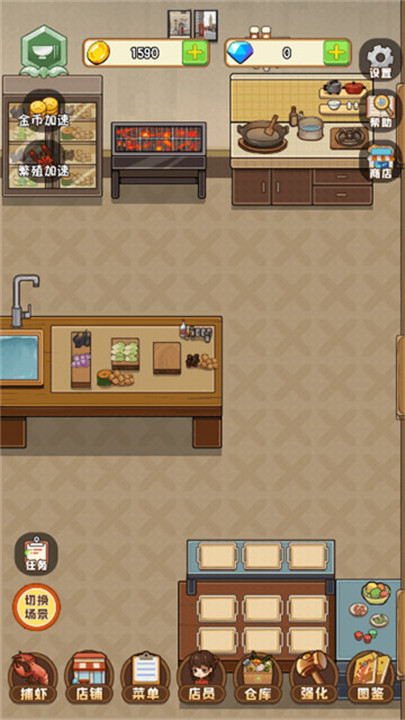 2、玩家可以在自家店里当一个大厨去做虾,顾客也让你做各种各样的虾。