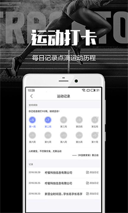 共同进步,一起来记录自己每周的运动情况,感受到自己每一天的进步。