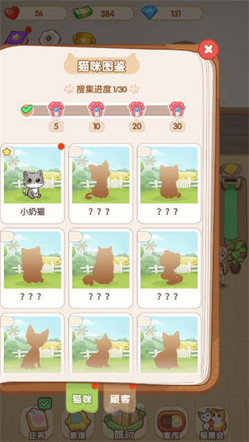 自带图鉴的系统,玩家可以随时查看是否有其他猫未被收集,喜欢猫咪的人,可以尝试一下,在游戏中获得治愈能力,很有娱乐性的经营游戏,非常适合每天有空闲的时候玩。