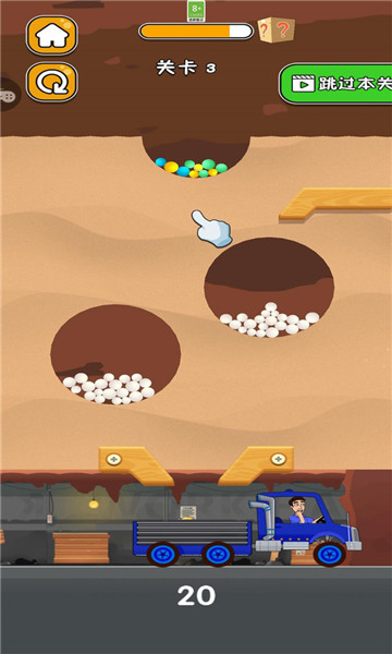1、游戏中玩家可以通过挖洞使球球下滑达到底部,顺利通过收集来装到车上。