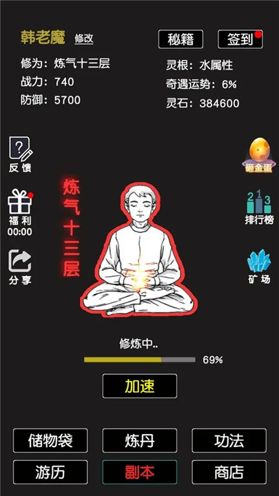 全服的修为和战力排名,难度有点高的副本,每天的签到,每天都会有奖励,修真世界,等待着你的挑战。