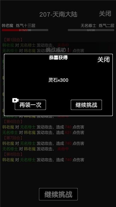 12、如果挑战失败了也别担心,可以继续通过炼丹、修法和提升装备等方式增强战力,再次挑战成功!