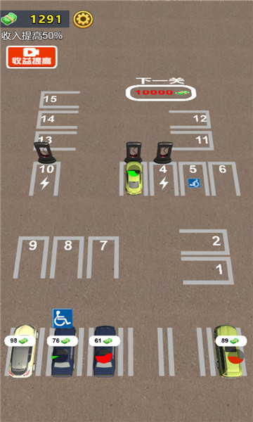 3、根据时间的不同可以收取不同的停车费,到达一定的数额的时候就能顺利解锁下一关。