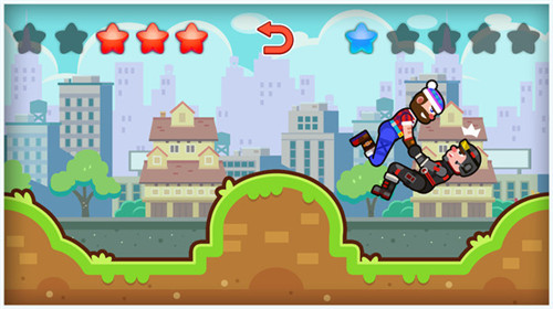 1、游戏中有两个手拉手的小人,玩家只需要动动手指,点击屏幕,游戏里的两个小人就会开始互相蹬腿腾空。