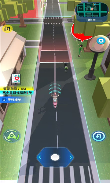 1、游戏中玩家将扮演外卖员,需要骑上电动车,穿梭在城市中的各条道路上。