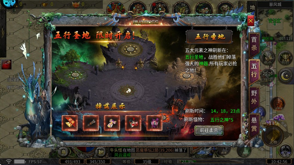 击杀五行之神将获得必爆元宝以及随机掉落的“神·六道阴阳”、“灵虚·神袍”、“无法无天链”、“瘟疫头盔”