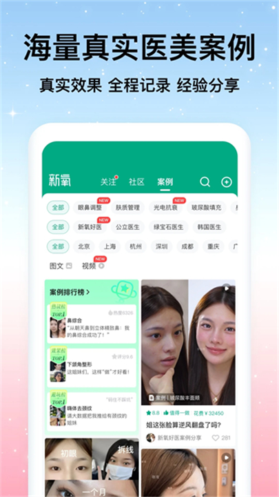 下载新氧医美app下载是提供全面美容和微整形服务的App,用户可以通过在线咨询与专业医生沟通,购买化妆品和护肤品。在新氧医美下载可以享受医疗团队的保障,确保服务安全有效,帮助用户实现美丽目标。