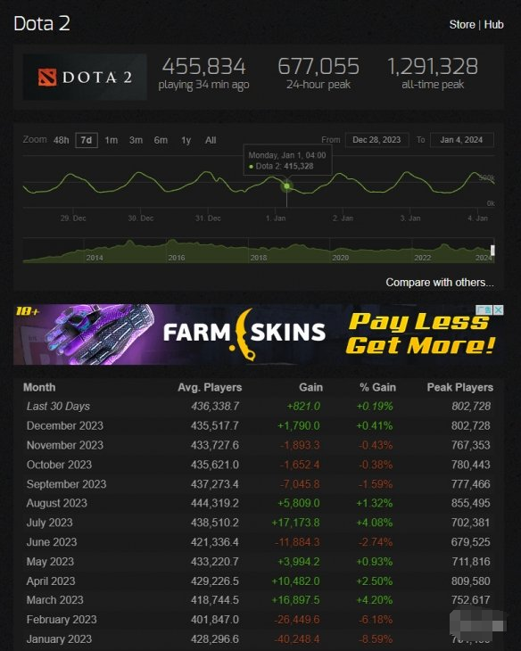 虽然《DOTA2》玩家经常自嘲《DOTA2》是Dead Game,但是根据SteamChart的数据统计,2023年《DOTA2》Steam在线峰值有三次超过了80万,分别是2023年4月,8月和12月。