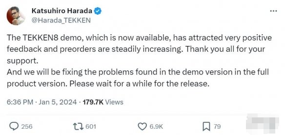 由于这个demo广受玩家好评,《铁拳8》本体的预售销量也有所提升。据《铁拳》系列游戏总监/总制作人原田胜弘透露,这次试玩demo吸引了玩家的良好评价,而游戏的预购量也在稳步提升。他非常感谢大家的支持。同时他也保证会修复demo版中发现的一些问题。